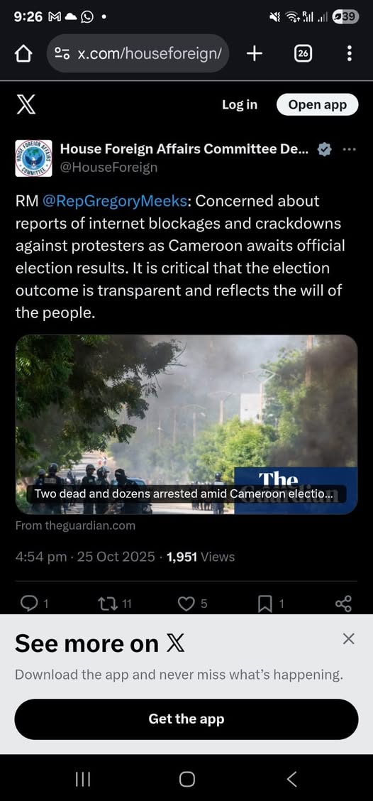 Le 26 octobre 2025, un membre du Congrès américain a exprimé ses préoccupations concernant les perturbations d’Internet et les violences à l’égard des manifestants au Cameroun, alors que le pays attend les résultats officiels des élections présidentielles.